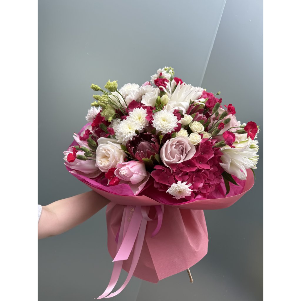 Velkorysá a hravá kytice laděná do jemných až sytých růžových tónů. Obsahuje velké množství druhů květin – růže, santiny, karafiáty, eustomy, proteáza, případně i sezónní květy dle aktuální nabídky. Výsledkem je přirozená, svěží a nadčasově krásná kytice, která potěší při jakékoli příležitosti.