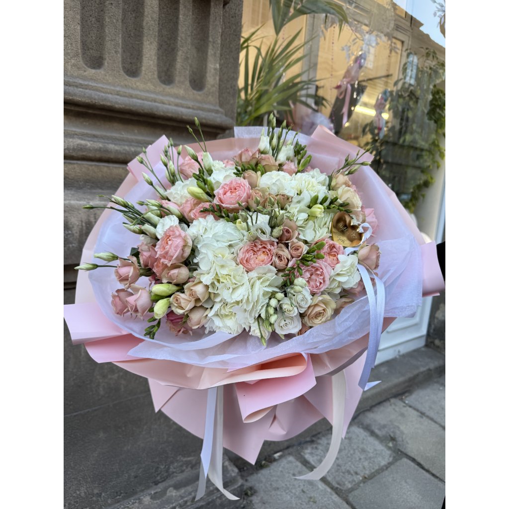 Elegantní a nadčasová kytice laděná do jemných béžových tónů, ve které dominuje velká hortenzie doplněná o béžové trsové růže a drobné sezónní květy v neutrálních barvách. Minimalistická, ale přitom výrazná – působí luxusně, čistě a přirozeně. Skvělá volba pro ty, kdo ocení decentní krásu a moderní květinový styl.