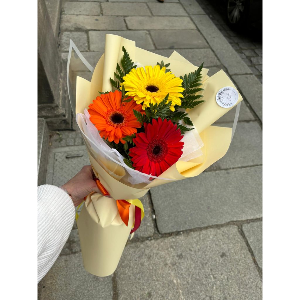 Malá, ale výrazná kytice složená ze tří dekorativně nazdobených gerber, doplněných o jemnou zeleň a mašli. Ideální jako drobné poděkování, pozornost pro kolegyni, nebo symbolické gesto.