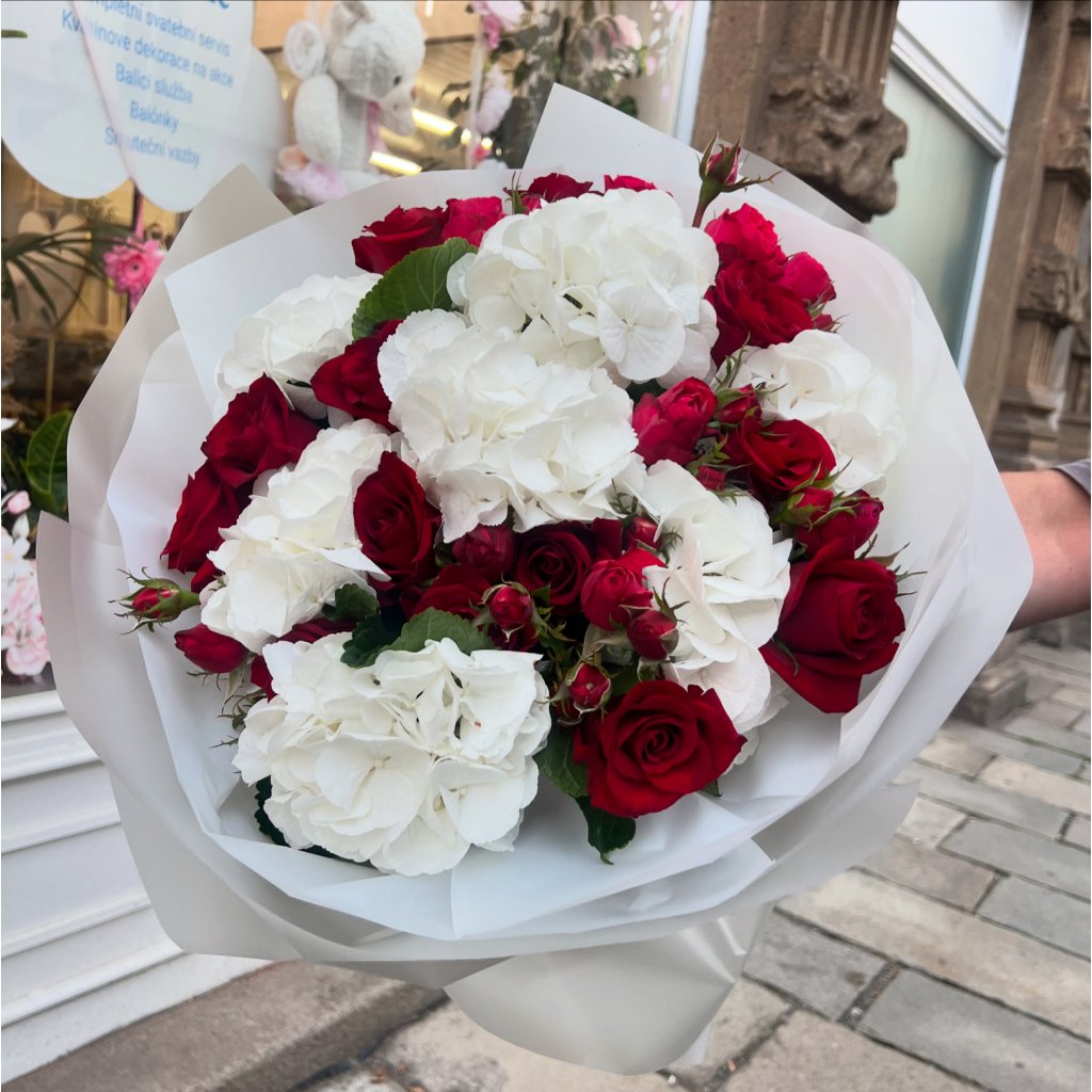 Kombinace bohaté bílé hortenzie a červených růží tvoří výrazný, kontrastní a zároveň elegantní celek. Kytice působí slavnostně, romanticky a zároveň důstojně – ideální volba pro významné příležitosti, výročí nebo jako dárek z lásky.