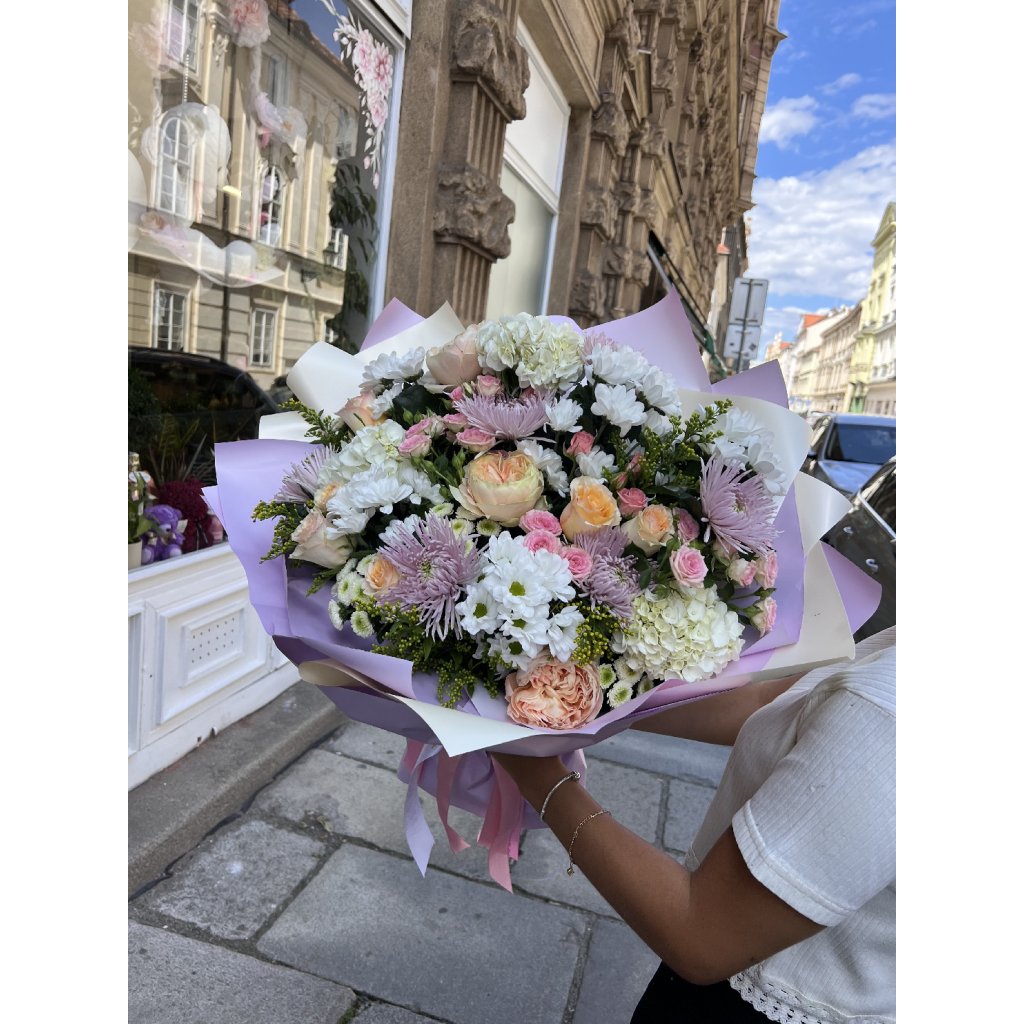 Tato kytice spojuje tajemnou fialovou s neutrální béžovou, čímž vytváří velmi elegantní, klidné a nadčasové ladění. Najdete v ní například růže, eustomy, chryzantémy, santinu, případně doplňkové sezónní květy. Působí romanticky, ale zároveň sofistikovaně – ideální pro vkusný dárek nebo slavnostní příležitost.