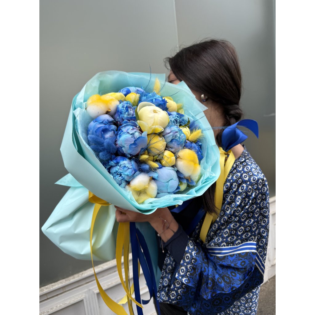 Tato kytice je výjimečná v každém ohledu. Spojení žlutých a speciálně tónovaných modrých pivoněk vytváří naprosto originální, luxusní a nezapomenutelný vzhled. Je určená pro výjimečné okamžiky a pro ty, kdo chtějí darovat něco, co se jen tak nevidí.