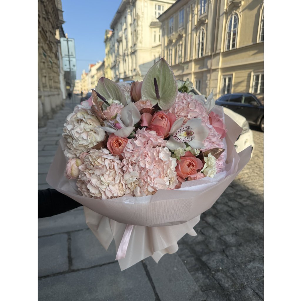 Luxusní kytice laděná do světlých tónů – najdete v ní vzdušné hortenzie, elegantní anturie a jemně vrstvené pivoňkové růže, které připomínají krajku. Nadčasové a přitom neokoukané spojení pro milovníky originálních květin.Vhodná jako svatební dar, pro výjimečné události nebo pro náročnější obdarované.