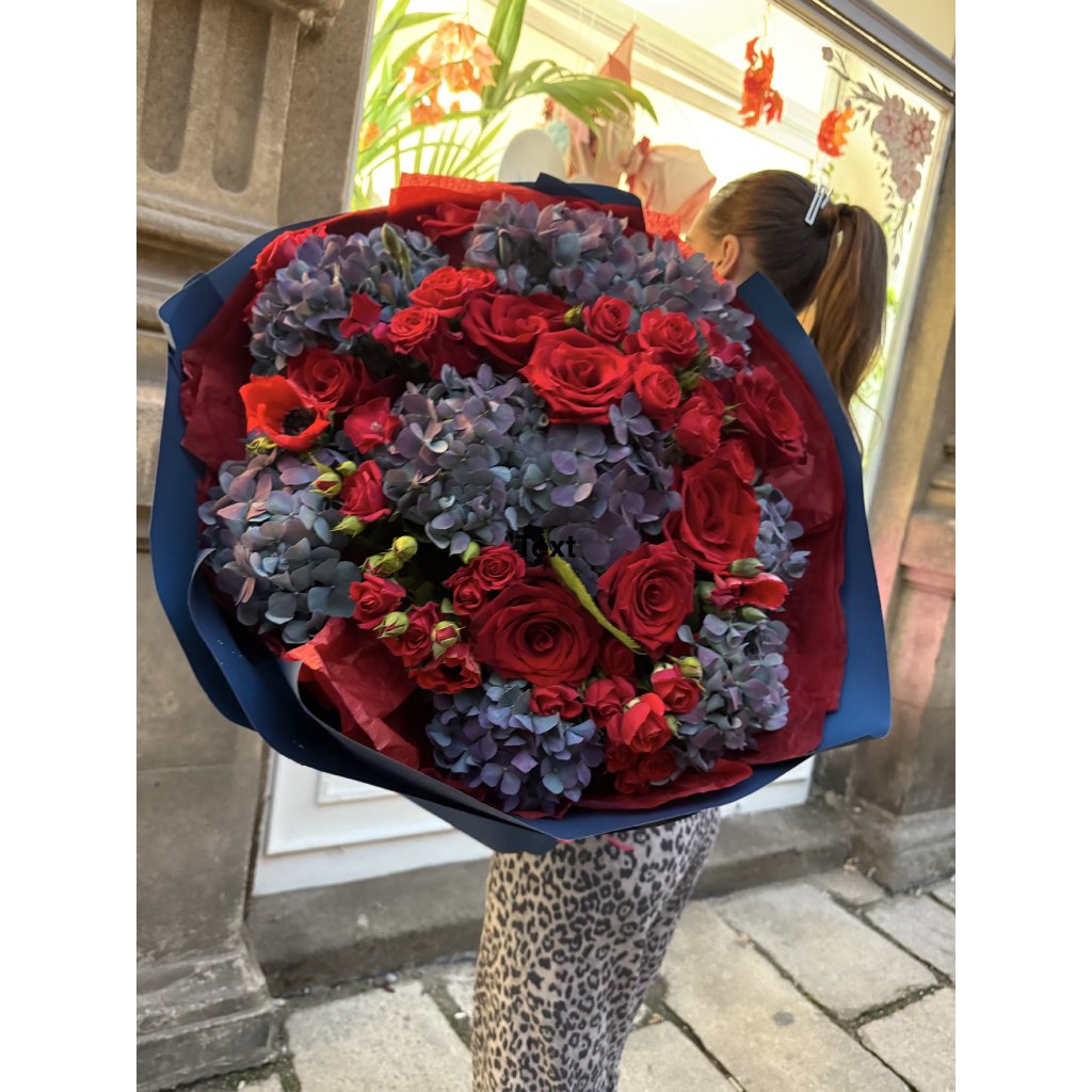 Elegantní a bohatá kytice složená z výběrových květin. Obsahuje sezónní exkluzivní hortenzie, které spolu s růžemi vytvářejí harmonický a reprezentativní celek – vhodný jako dárek k významným událostem nebo jako pozornost, která opravdu potěší.