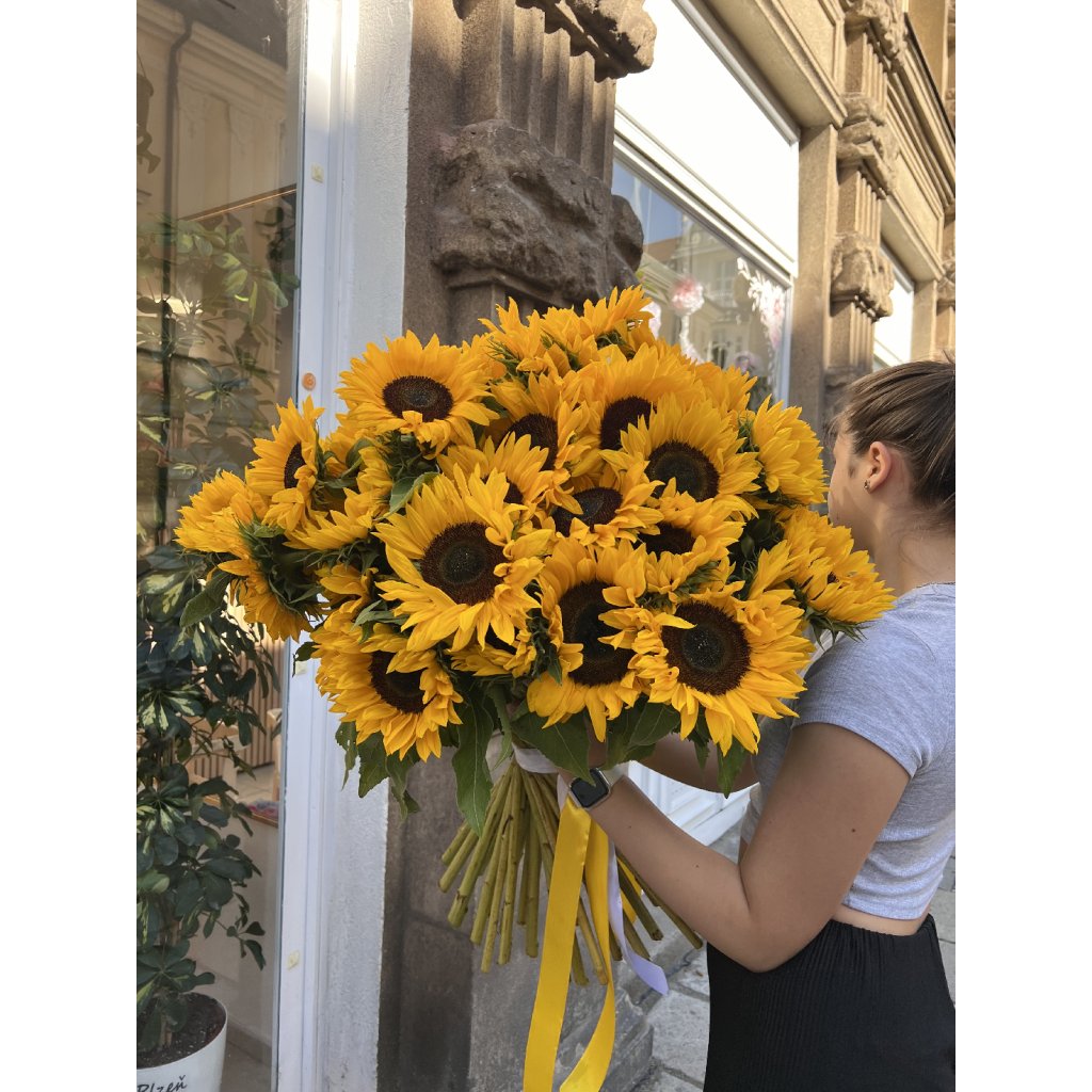 🌻 Slunečnice jsou k dispozici pouze v sezóně – červenec až listopad.🌸 Doprovodné květy se mohou mírně lišit dle aktuální nabídky, celkový vzhled a barevnost zůstávají zachovány.