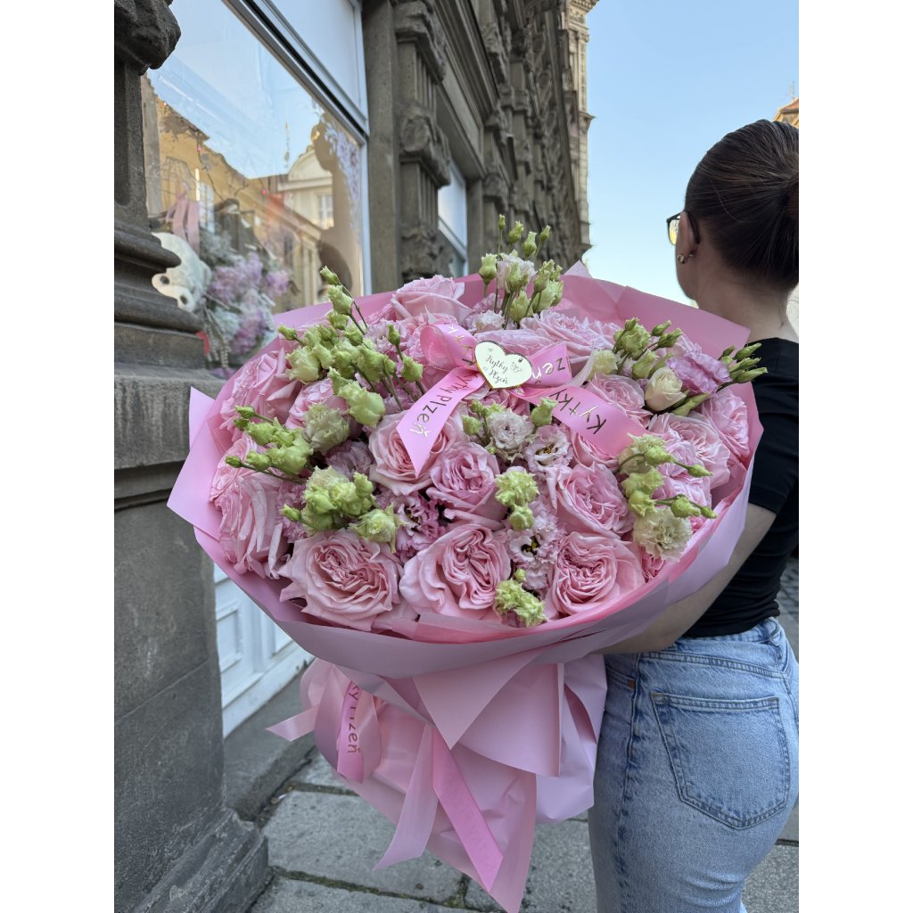 Tato kytice spojuje to nejlepší z růžového světa – plnokvěté růže O’Hara, známé svou omamnou vůní a krajkovým vzhledem, a kudrnaté (plnokvěté) eustomy, které přidávají jemnost, objem a romantický nádech. Celek působí velmi bohatě, vzdušně a něžně zároveň.