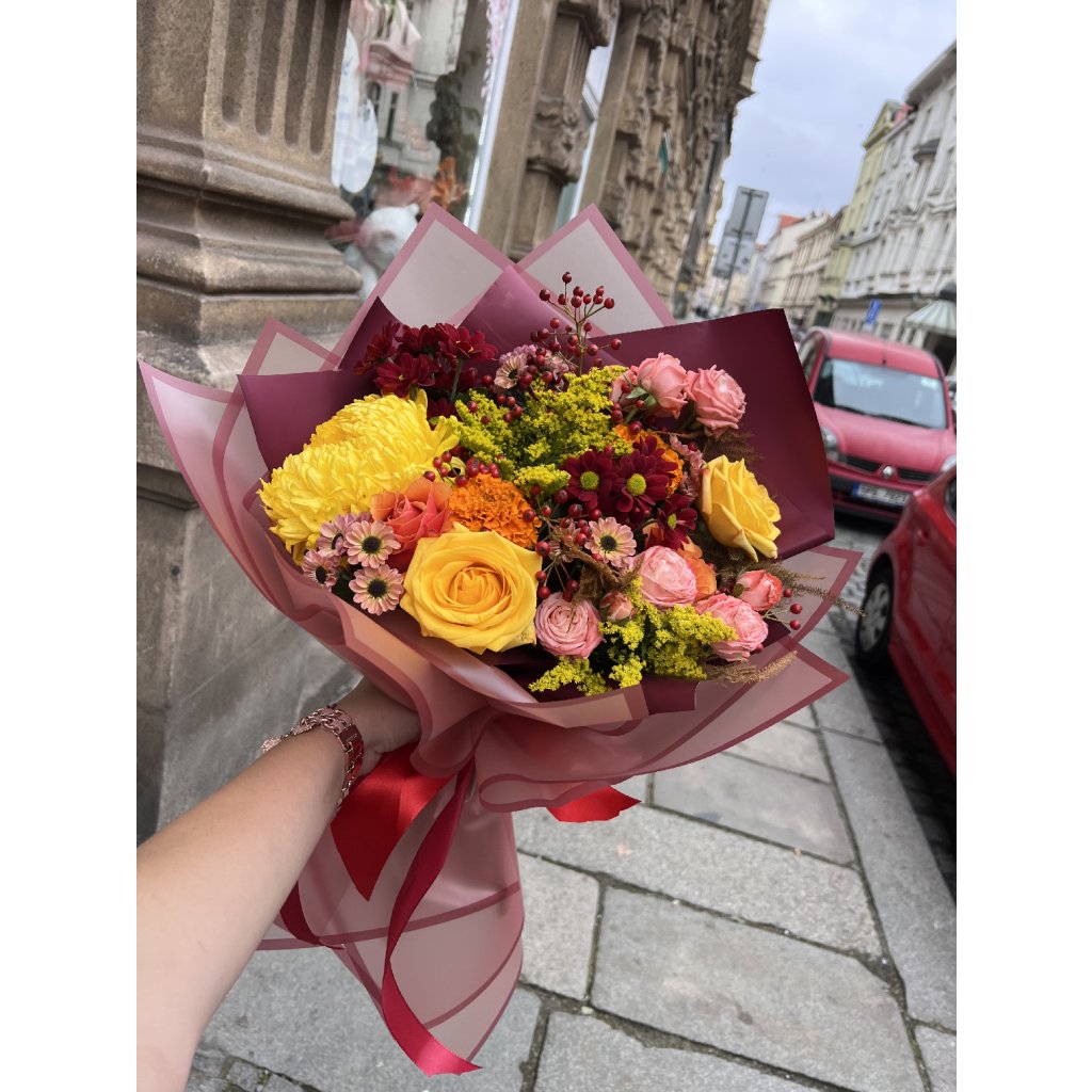 Žlutá jednohlavá chryzantéma (sezónní), dostupná pouze v období září–říjen.Mimo sezónu lze nahradit klasickými žlutými chryzantémami s menšími květy.