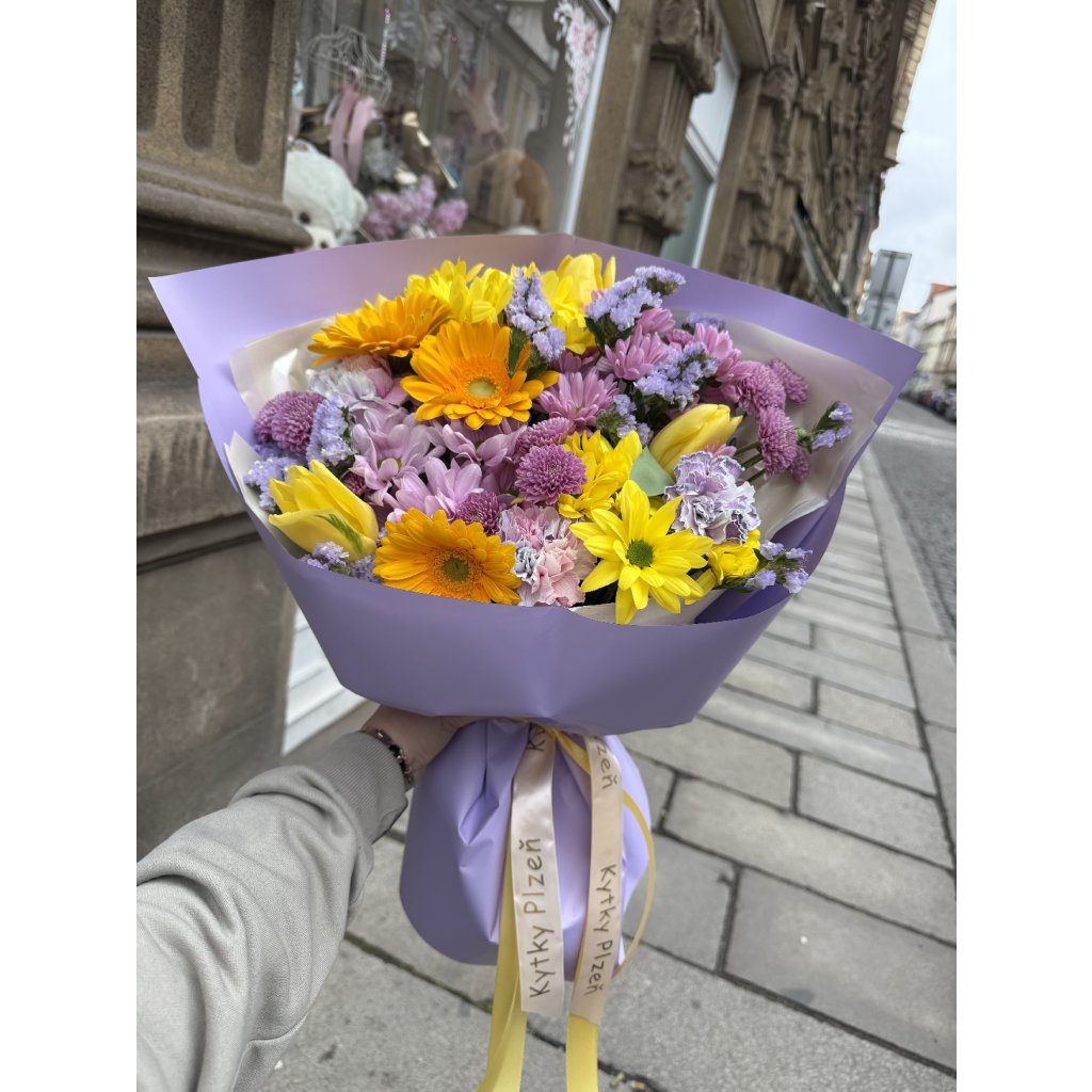 Tulipány, upozorňujeme, že jsou dostupné pouze v sezóně – listopad až duben.Mimo tuto dobu lze květinu vytvořit i bez tulipánů – nahradíme je vhodnou alternativou dle aktuální nabídky.