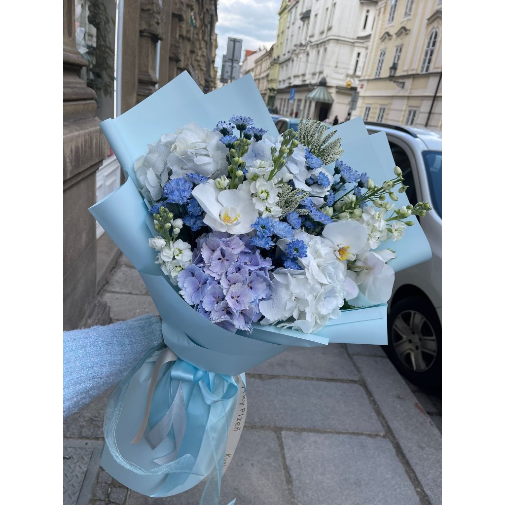 Luxusní a svěží kytice v chladivých odstínech modré a bílé působí klidně, čistě a výjimečně. Obsahuje kombinaci hortenzie, orchideje, eustomy, statice a dalších sezónních květin. Skvělá volba pro ty, kteří milují decentní eleganci a originální barevné ladění.