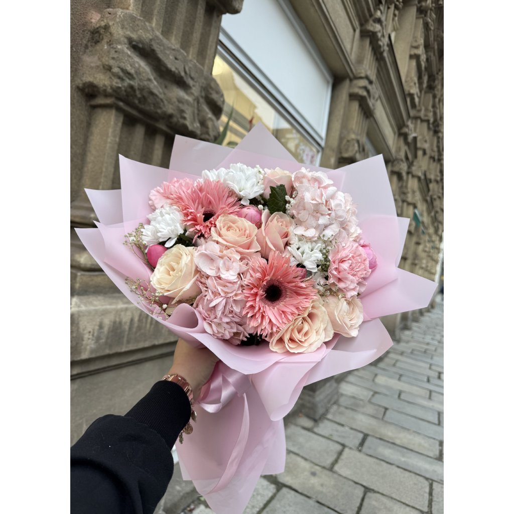 Jemná, elegantní kytice laděná do růžovo-bílých odstínů, ideální pro romantické duše. Obsahuje květy, které společně vytvářejí jemný, luxusní a zároveň něžný dojem. Skvělá volba pro výročí, svatby, narozeniny nebo jako milý dárek z lásky.