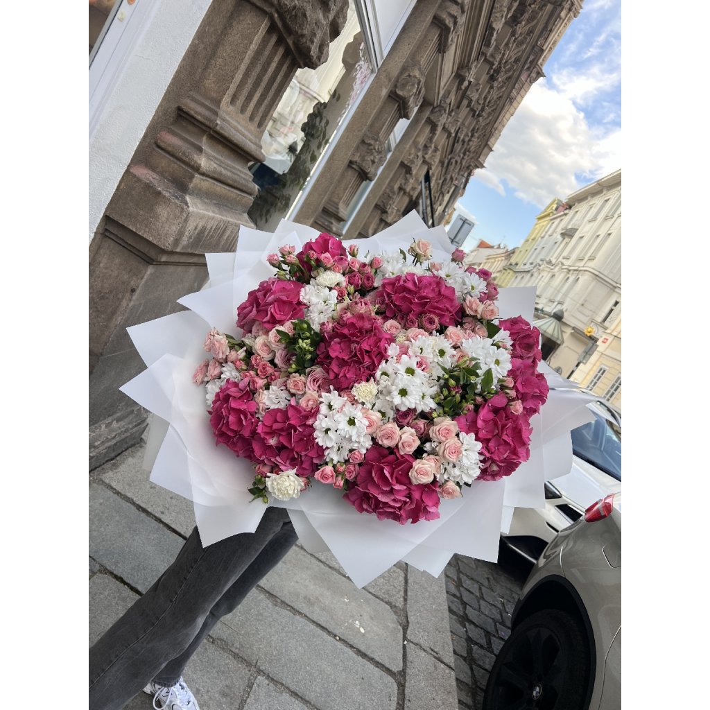 Tato působivá kytice je doslova „wow efekt“ na první pohled. Dominují v ní tmavě růžové hortenzie, které jsou samy o sobě velmi bohaté a výrazné. Doplňují je další sezónní květiny – například růže, eustomy, santiny nebo karafiáty – vše laděno do sytějších, elegantních tónů.