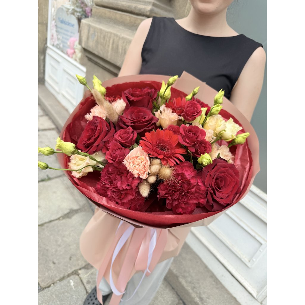 Intenzivní a smyslná kytice plná hlubokých emocí. Dominují jí sametově červené růže, karafiáty a germíny doplněné o jemné eustomy a přírodní sušené trávy. Symbol síly, lásky a touhy – ideální jako vyznání, k výročí nebo pro někoho, kdo má rád výrazné, nepřehlédnutelné květiny.