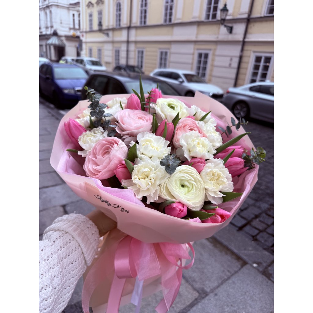 kytice, která na první pohled působí něžně, ale ve skutečnosti patří mezi to nejluxusnější, co sezóna nabízí. Vzdušná zeleň dodává kompozici lehkost a přirozený pohyb, plné hlavy ranunculů přinášejí hebkost a eleganci, zatímco tulipány dodávají svěžest a jarní energii. Barevnost je zářivá, čistá a nepřehlédnutelná, přesně taková, která rozzáří interiér i náladu.
