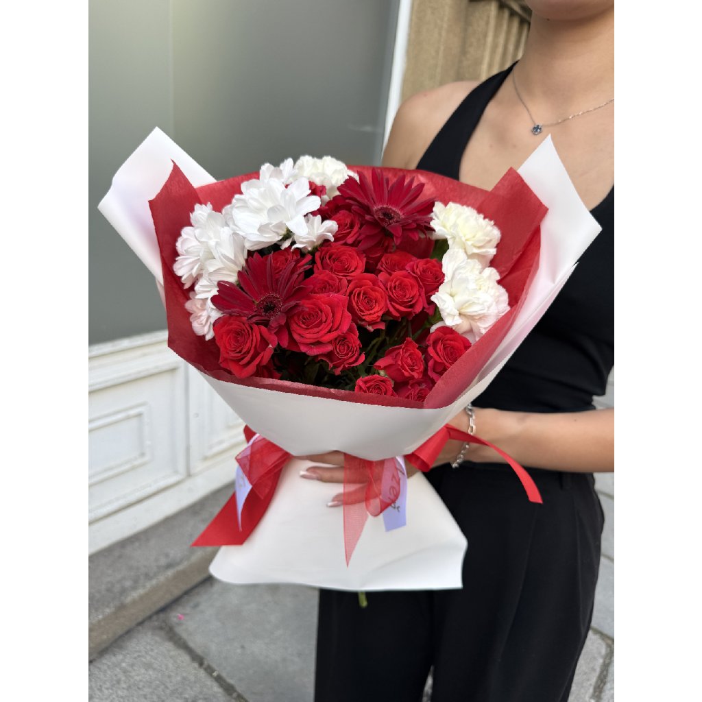Elegantní kytice laděná do červeno-bílých tónů, ideální pro výjimečné příležitosti i jako gesto lásky. Kombinace rudých růží, červených gerber a bílých chryzantém vytváří harmonický a výrazný dojem. Kytice je balena do luxusního obalu s červenou stuhou. Vhodná jako dárek k narozeninám, výročí nebo jen tak pro radost.