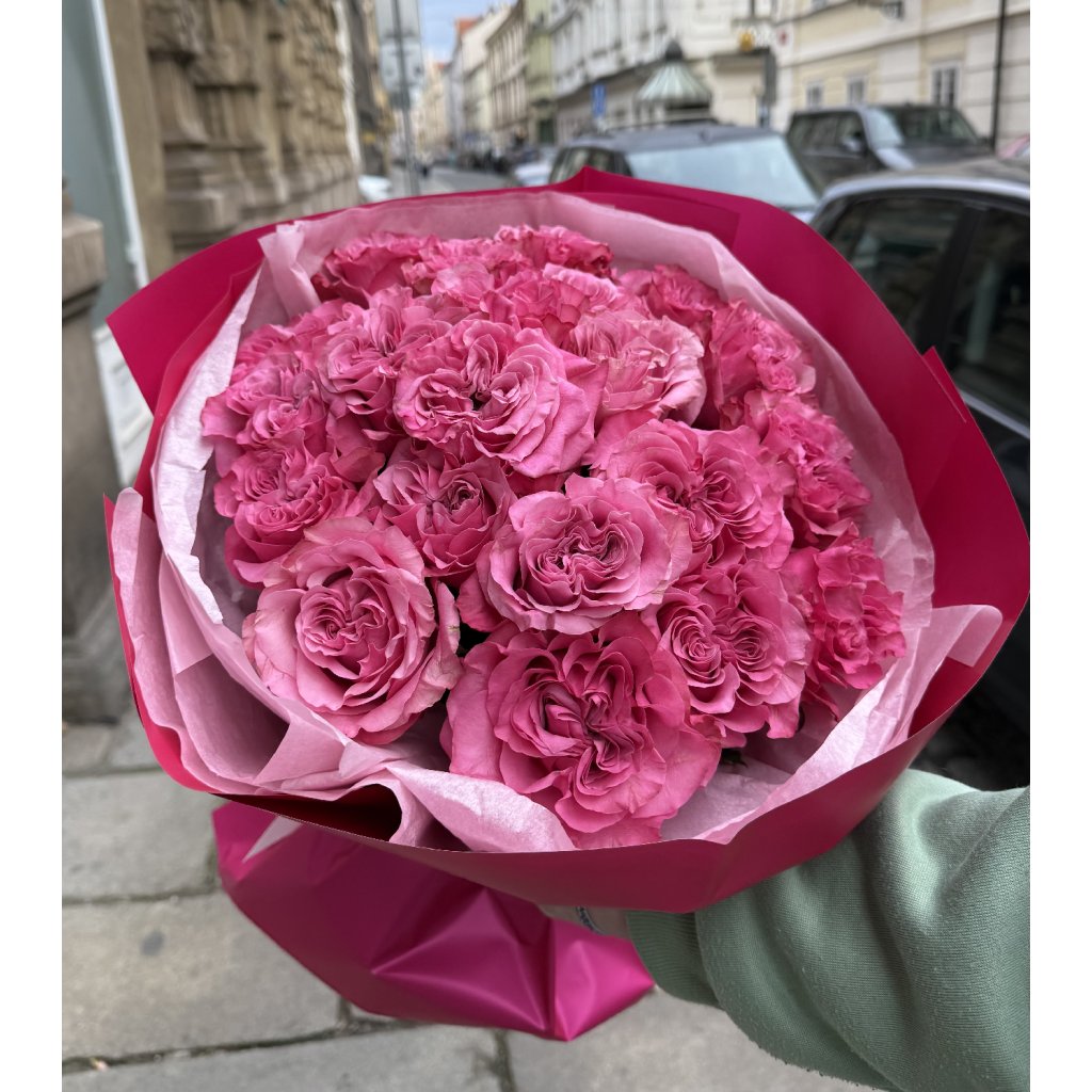 Romantická a nadčasová kytice složená z exkluzivních pivoňkových růží v růžové barvě(na foto 21ks). Tyto růže mají bohatě vrstvené okvětní plátky, které připomínají jemnou krajku – působí luxusně, vzdušně a velmi ženským dojmem.