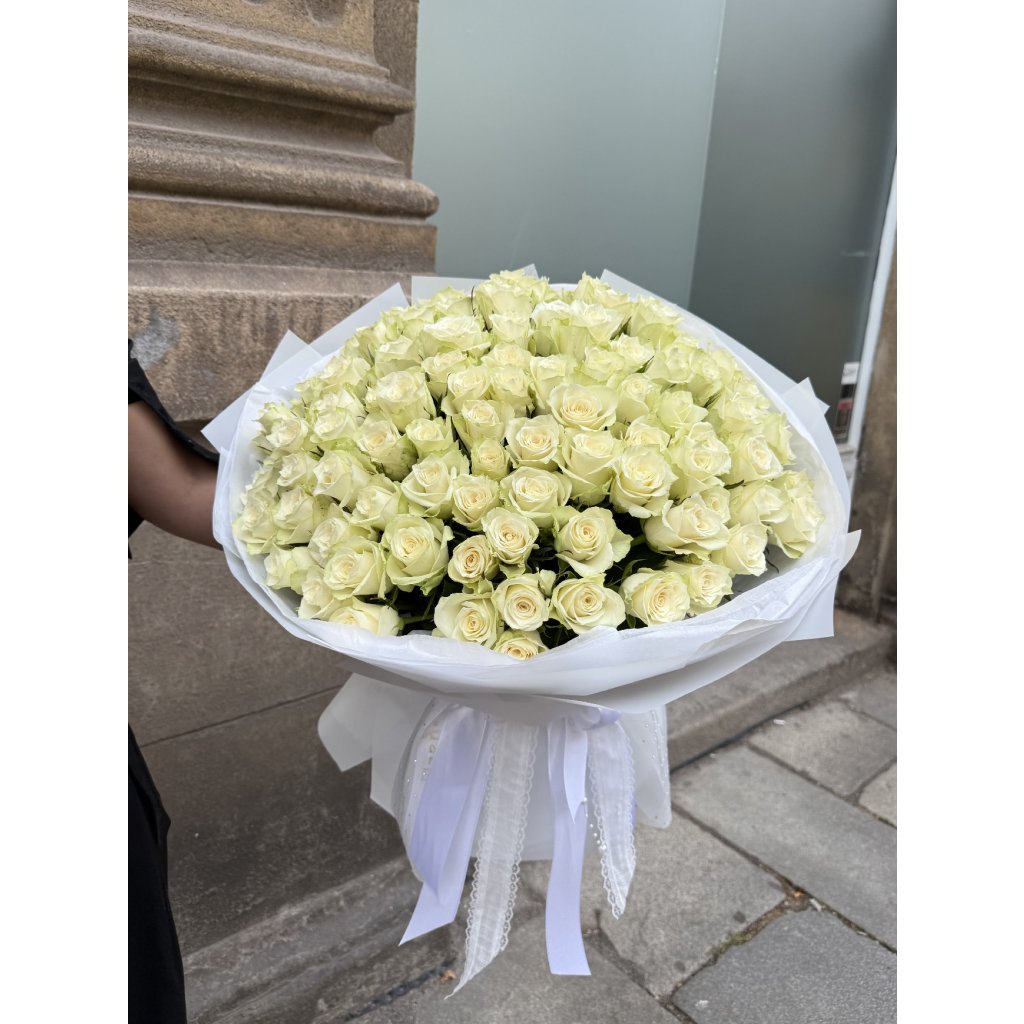 Tato kytice ze 101 kusů růží odrůdy Athena (délka 50 cm) působí elegantně, čistě a velkolepě zároveň. Bílé růže Athena mají jemně krémový nádech, kompaktní květ a vysokou výdrž – ideální pro slavnostní příležitosti, svatby, výročí nebo jako výraz lásky a úcty.